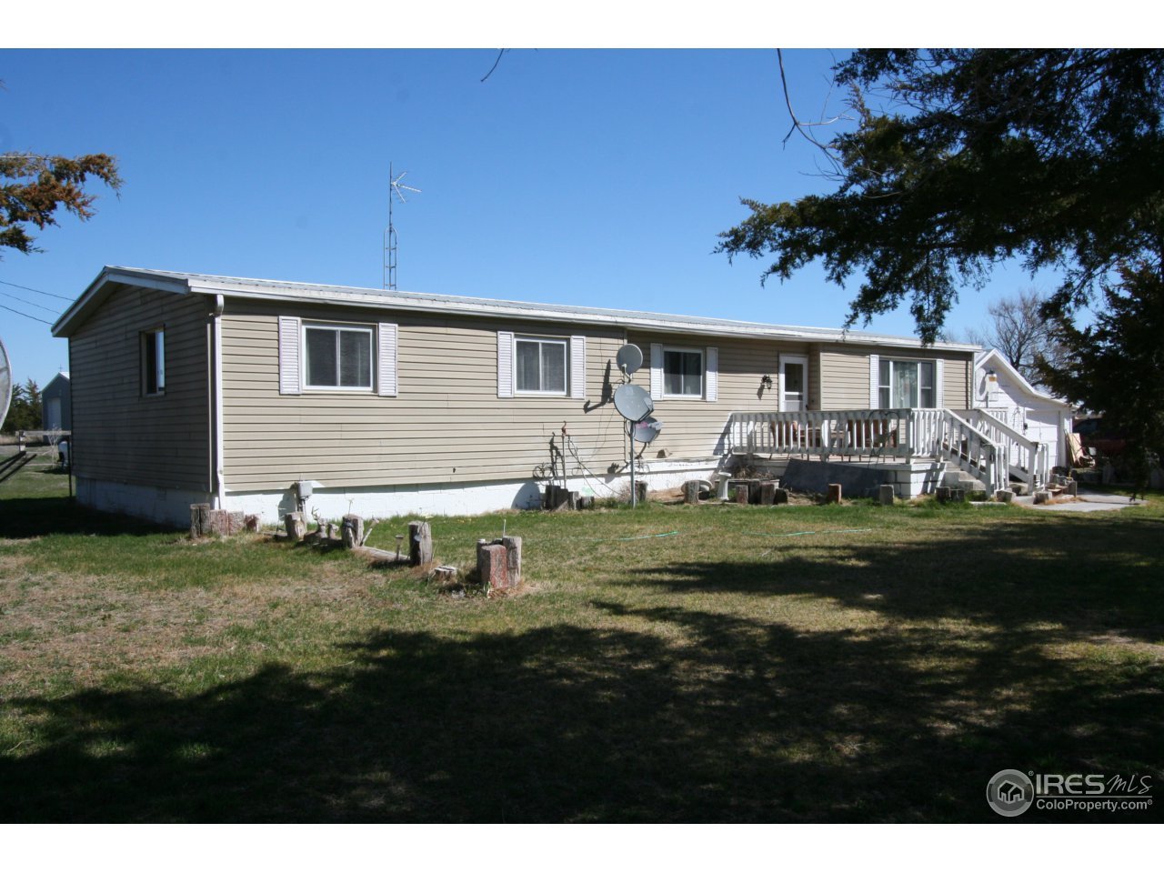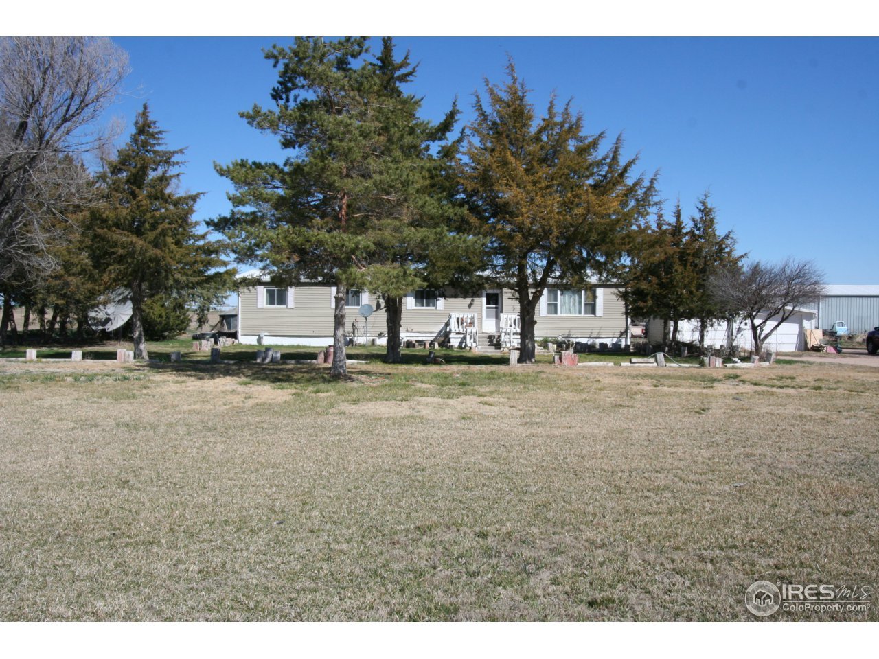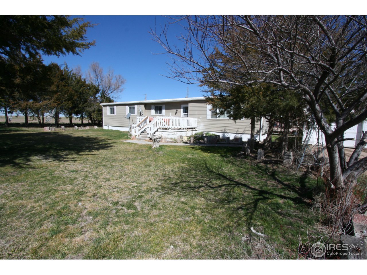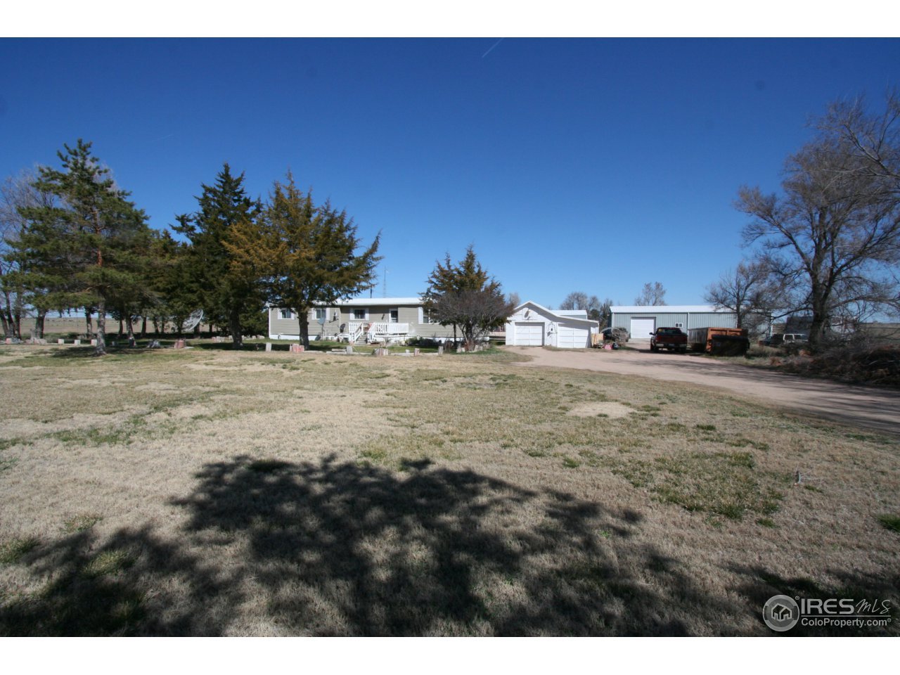 This peaceful property is located on a paved county road just North of Brush & Snyder. 5 Acres with a manufactured ranch style home that has 3 bedrooms & 2 bathrooms. Could be an established property for a custom home if Buyer desires with utilities, trees, grass already in place! 2 Shops, yes 2 that are in great condition. One of the shops is insulated & heated! Very large front yard with lots of trees!